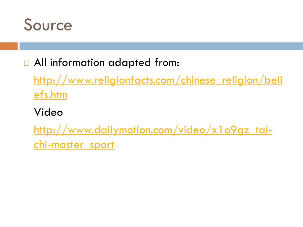 Source • All information adapted from: http://www.religionfacts.com/chinese_religion/beliefs.htm Video http://www.dailymotion.com/video/x1o9gz_tai-chi-master_sport