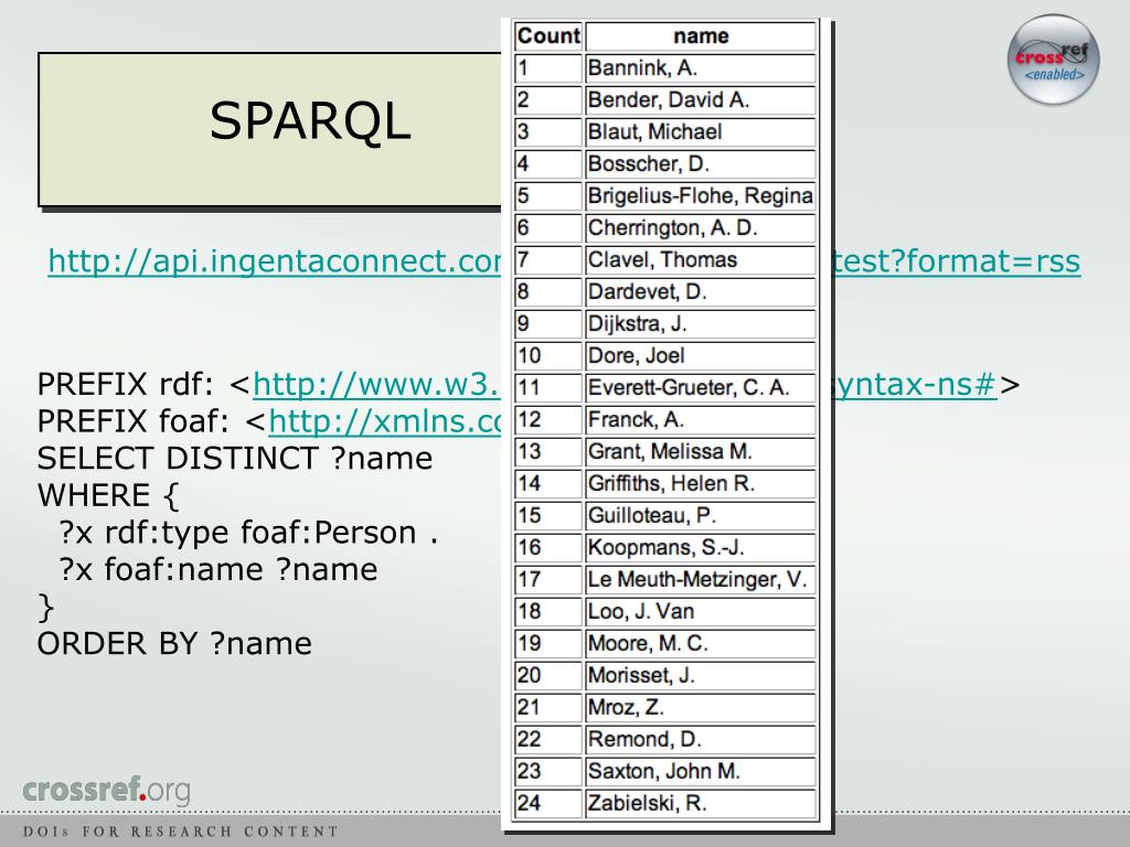 SPARQL http://api.ingentaconnect.com/content/cabi/nrr/latest?format=rss PREFIX rdf: <http://www.w3.org/1999/02/22-rdf-syntax-ns#> PREFIX foaf: <http://xmlns.com/foaf/0.1/> SELECT DISTINCT ?name WHERE { ?x rdf:type foaf:Person . ?x foaf:name ?name } ORDER BY ?name
