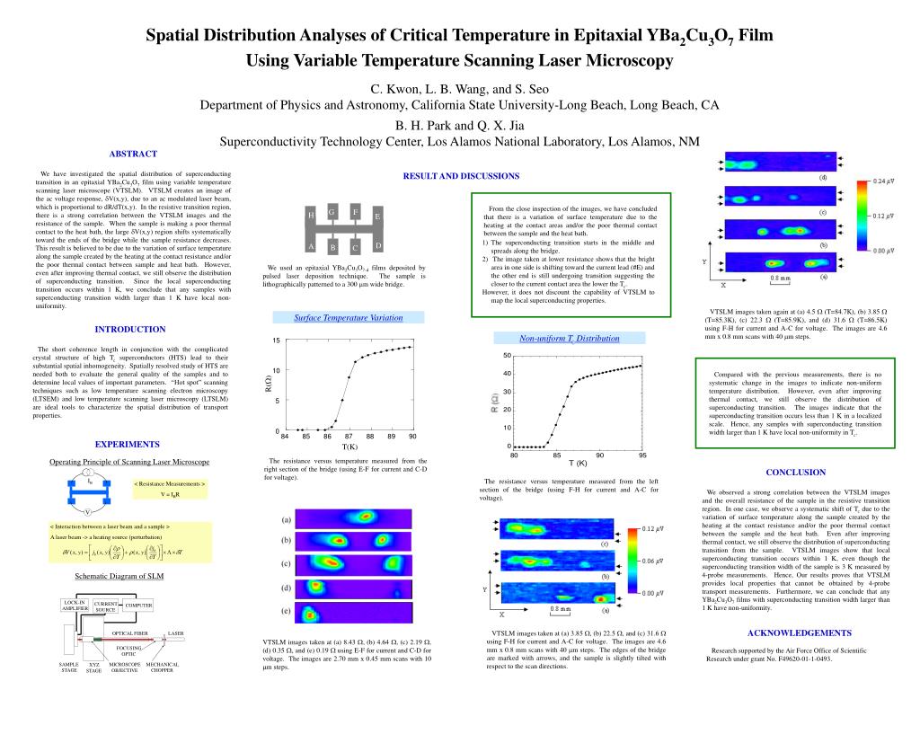 Schematic Diagram of SLM IB LOCK-IN AMPLIFIER CURRENT SOURCE COMPUTER V OPTICAL FIBER LASER FOCUSING OPTIC XYZ STAGE SAMPLE STAGE MECHANICAL CHOPPER MICROSCOPE OBJECTIVE G F From the close inspection of the images, we have concluded that there is a variation of surface temperature due to the heating at the contact areas and/or the poor thermal contact between the sample and the heat bath. 15 H E R(W) 10 D • The superconducting transition starts in the middle and spreads along the bridge. • The image taken at lower resistance shows that the bright area in one side is shifting toward the current lead (#E) and the other end is still undergoing transition suggesting the closer to the current contact area the lower the Tc. • However, it does not discount the capability of VTSLM to map the local superconducting properties. A B C 5 We used an epitaxial YBa2Cu3O7-d films deposited by pulsed laser deposition technique. The sample is lithographically patterned to a 300 mm wide bridge. 0 84 85 86 87 88 89 90 T(K) The resistance versus temperature measured from the right section of the bridge (using E-F for current and C-D for voltage). Compared with the previous measurements, there is no systematic change in the images to indicate non-uniform temperature distribution. However, even after improving thermal contact, we still observe the distribution of superconducting transition. The images indicate that the superconducting transition occurs less than 1 K in a localized scale. Hence, any samples with superconducting transition width larger than 1 K have local non-uniformity in Tc. VTSLM images taken again at (a) 4.5 (T=84.7K), (b) 3.85 (T=85.3K), (c) 22.3 (T=85.9K), and (d) 31.6 (T=86.5K) using F-H for current and A-C for voltage. The images are 4.6 mm x 0.8 mm scans with 40 mm steps. Operating Principle of Scanning Laser Microscope < Resistance Measurements > V = IBR The resistance versus temperature measured from the left section of the bridge (using F-H for current and A-C for voltage). < Interaction between a laser beam and a sample > A laser beam -> a heating source (perturbation) VTSLM images taken at (a) 3.85 , (b) 22.5 , and (c) 31.6 using F-H for current and A-C for voltage. The images are 4.6 mm x 0.8 mm scans with 40 mm steps. The edges of the bridge are marked with arrows, and the sample is slightly tilted with respect to the scan directions. VTSLM images taken at (a) 8.43 , (b) 4.64 , (c) 2.19 , (d) 0.35 , and (e) 0.19 using E-F for current and C-D for voltage. The images are 2.70 mm x 0.45 mm scans with 10 mm steps. Spatial Distribution Analyses of Critical Temperature in Epitaxial YBa2Cu3O7 Film Using Variable Temperature Scanning Laser Microscopy C. Kwon, L. B. Wang, and S. Seo Department of Physics and Astronomy, California State University-Long Beach, Long Beach, CA B. H. Park and Q. X. Jia Superconductivity Technology Center, Los Alamos National Laboratory, Los Alamos, NM ABSTRACT We have investigated the spatial distribution of superconducting transition in an epitaxial YBa2Cu3O7 film using variable temperature scanning laser microscope (VTSLM). VTSLM creates an image of the ac voltage response, V(x,y), due to an ac modulated laser beam, which is proportional to dR/dT(x,y). In the resistive transition region, there is a strong correlation between the VTSLM images and the resistance of the sample. When the sample is making a poor thermal contact to the heat bath, the large V(x,y) region shifts systematically toward the ends of the bridge while the sample resistance decreases. This result is believed to be due to the variation of surface temperature along the sample created by the heating at the contact resistance and/or the poor thermal contact between sample and heat bath. However, even after improving thermal contact, we still observe the distribution of superconducting transition. Since the local superconducting transition occurs within 1 K, we conclude that any samples with superconducting transition width larger than 1 K have local non-uniformity. RESULT AND DISCUSSIONS Surface Temperature Variation INTRODUCTION The short coherence length in conjunction with the complicated crystal structure of high Tc superconductors (HTS) lead to their substantial spatial inhomogeneity. Spatially resolved study of HTS are needed both to evaluate the general quality of the samples and to determine local values of important parameters. “Hot spot” scanning techniques such as low temperature scanning electron microscopy (LTSEM) and low temperature scanning laser microscopy (LTSLM) are ideal tools to characterize the spatial distribution of transport properties. Non-uniform Tc Distribution EXPERIMENTS CONCLUSION We observed a strong correlation between the VTSLM images and the overall resistance of the sample in the resistive transition region. In one case, we observe a systematic shift of Tc due to the variation of surface temperature along the sample created by the heating at the contact resistance and/or the poor thermal contact between the sample and the heat bath. Even after improving thermal contact, we still observe the distribution of superconducting transition from the sample. VTSLM images show that local superconducting transition occurs within 1 K, even though the superconducting transition width of the sample is 3 K measured by 4-probe measurements. Hence, Our results proves that VTSLM provides local properties that cannot be obtained by 4-probe transport measurements. Furthermore, we can conclude that any YBa2Cu3O7 films with superconducting transition width larger than 1 K have non-uniformity. ACKNOWLEDGEMENTS Research supported by the Air Force Office of Scientific Research under grant No. F49620-01-1-0493.