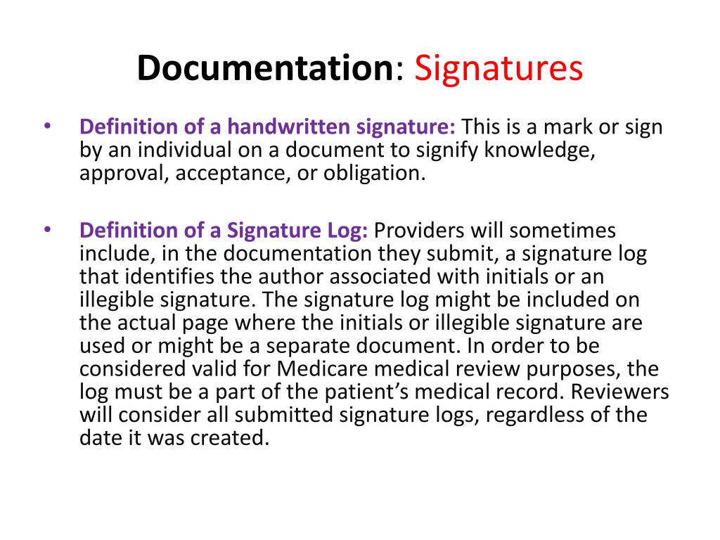 Documentation: Signatures Definition of a handwritten signature:This is a mark or sign by an individual on a document to signify knowledge, approval, acceptance, or obligation. Definition of a Signature Log:Providers will sometimes include, in the documentation they submit, a signature log that identifies the author associated with initials or an illegible signature. The signature log might be included on the actual page where the initials or illegible signature are used or might be a separate document. In order to be considered valid for Medicare medical review purposes, the log must be a part of the patient’s medical record. Reviewers will consider all submitted signature logs, regardless of the date it was created.