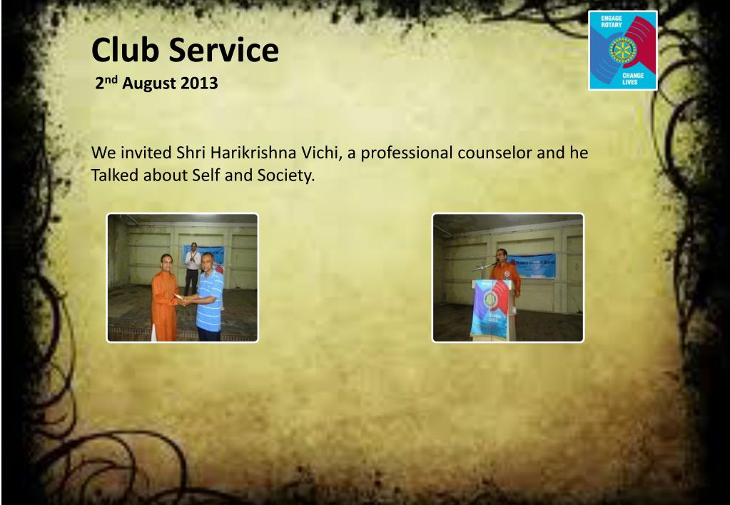 Club Service 2nd August 2013 We invited ShriHarikrishnaVichi, a professional counselor and he Talked about Self and Society.