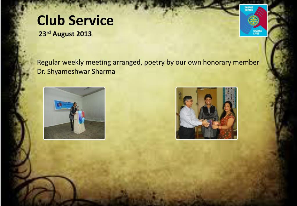 Club Service 23rdAugust 2013 Regular weekly meeting arranged, poetry by our own honorary member Dr. Shyameshwar Sharma
