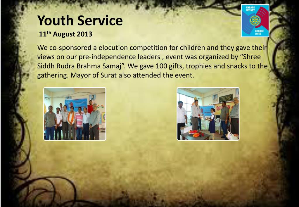 Youth Service 11thAugust 2013 We co-sponsored a elocution competition for children and they gave their views on our pre-independence leaders , event was organized by “Shree SiddhRudra Brahma Samaj”. We gave 100 gifts, trophies and snacks to the gathering. Mayor of Surat also attended the event.