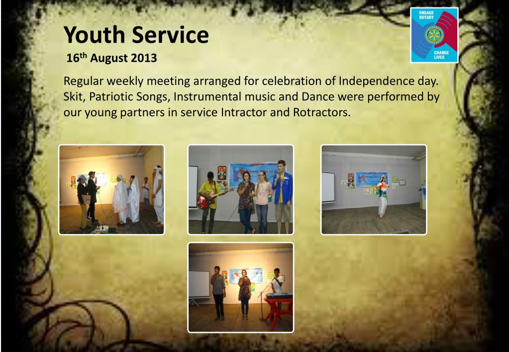 Youth Service 16thAugust 2013 Regular weekly meeting arranged for celebration of Independence day. Skit, Patriotic Songs, Instrumental music and Dance were performed by our young partners in service Intractor and Rotractors.