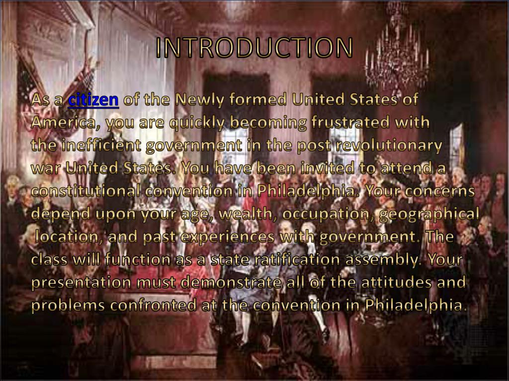 INTRODUCTION As a citizen of the Newly formed United Statesof America, you are quickly becoming frustratedwith the inefficient government in the postrevolutionary war United States. You have beeninvited to attend a constitutional convention inPhiladelphia. Your concerns depend upon yourage, wealth, occupation, geographical location, and past experiences with government. The class will function as a state ratification assembly. Your presentation must demonstrate all of the attitudes and problems confronted at the convention in Philadelphia.