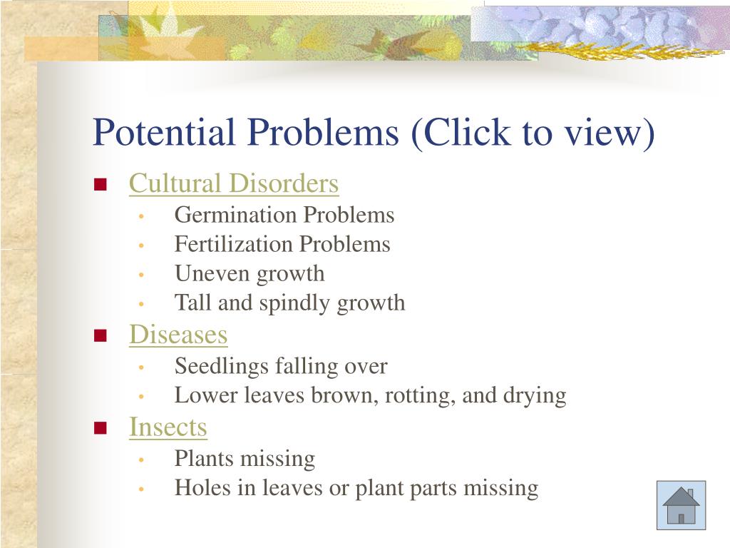 Potential Problems (Click to view) • Cultural Disorders • Germination Problems • Fertilization Problems • Uneven growth • Tall and spindly growth • Diseases • Seedlings falling over • Lower leaves brown, rotting, and drying • Insects • Plants missing • Holes in leaves or plant parts missing