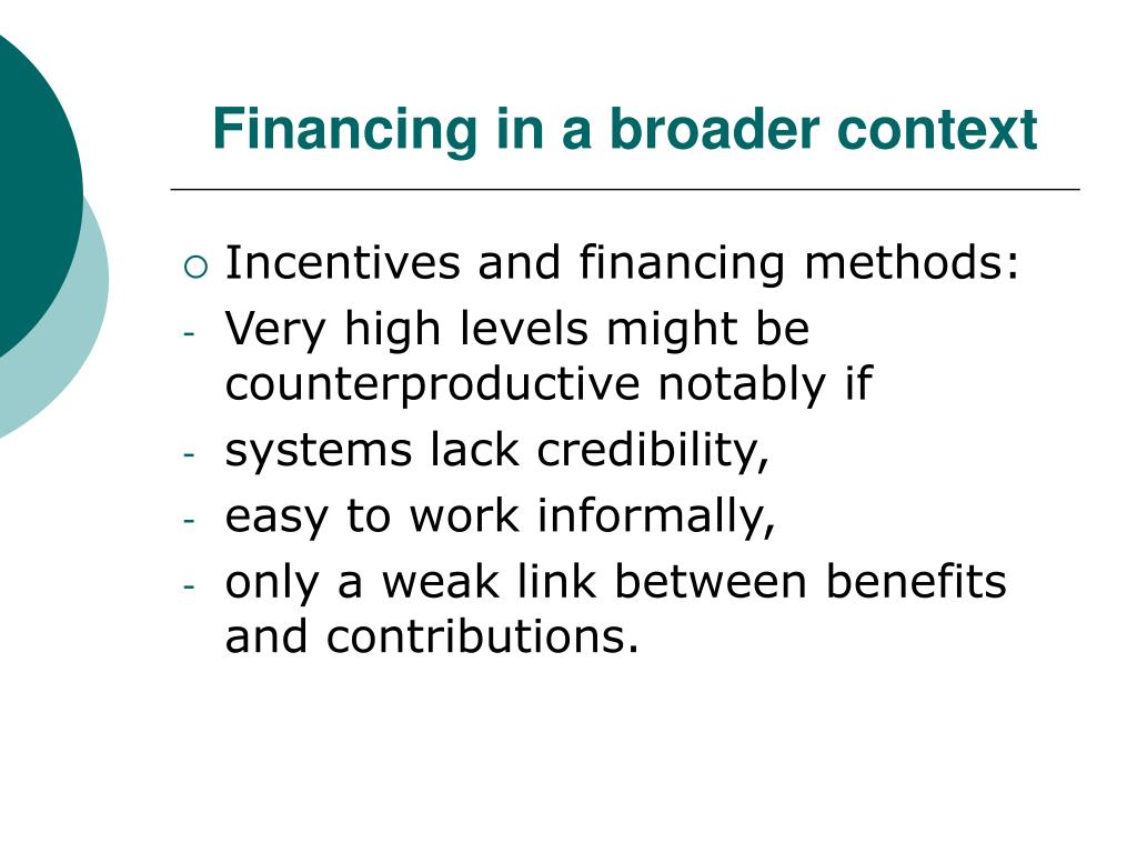 Financing in a broader context • Incentives and financing methods: • Very high levels might be counterproductive notably if • systems lack credibility, • easy to work informally, • only a weak link between benefits and contributions.