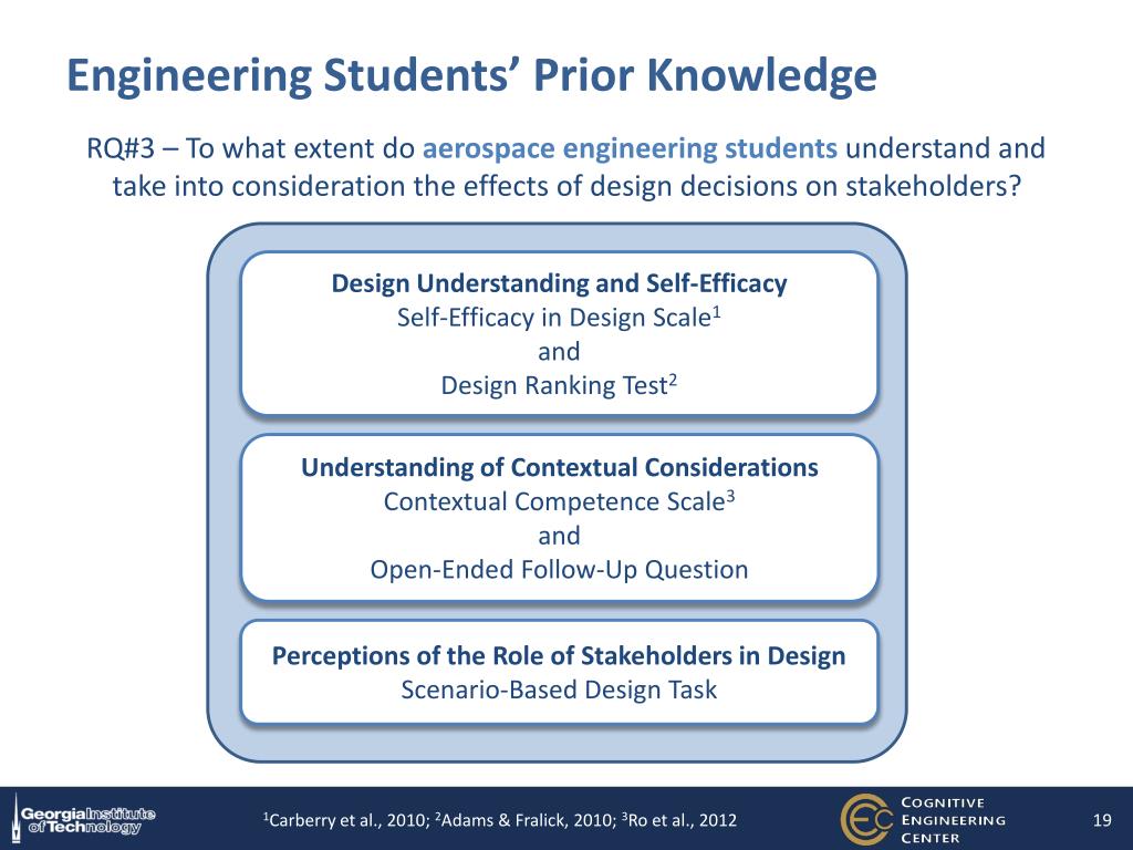 Engineering Students’ Prior Knowledge Design Understanding and Self-Efficacy Self-Efficacy in Design Scale1 and Design Ranking Test2 Understanding of Contextual Considerations Contextual Competence Scale3 and Open-Ended Follow-Up Question Perceptions of the Role of Stakeholders in Design Scenario-Based Design Task RQ#3 – To what extent do aerospace engineering students understand and take into consideration the effects of design decisions on stakeholders? 1Carberry et al., 2010; 2Adams & Fralick, 2010; 3Ro et al., 2012