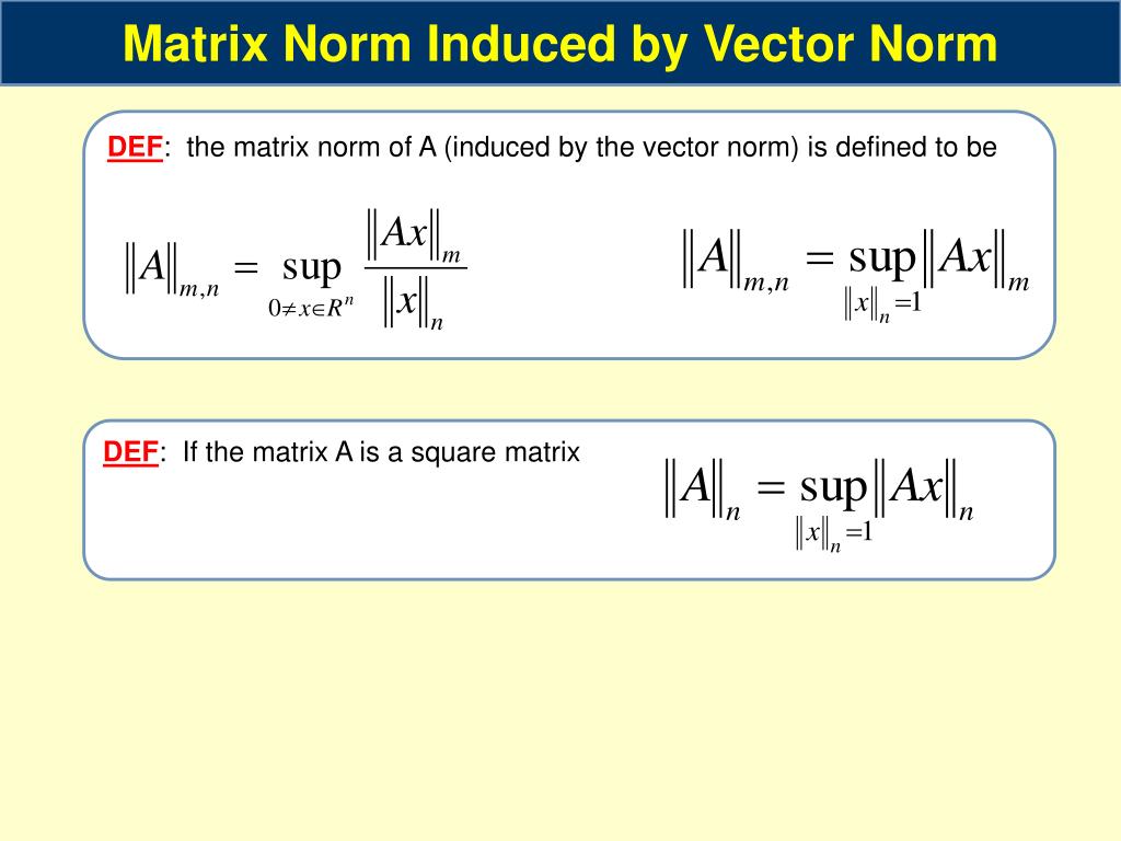 Matrix Norm Induced by Vector Norm DEF: the matrix norm of A (induced by the vector norm) is defined to be DEF: If the matrix A is a square matrix