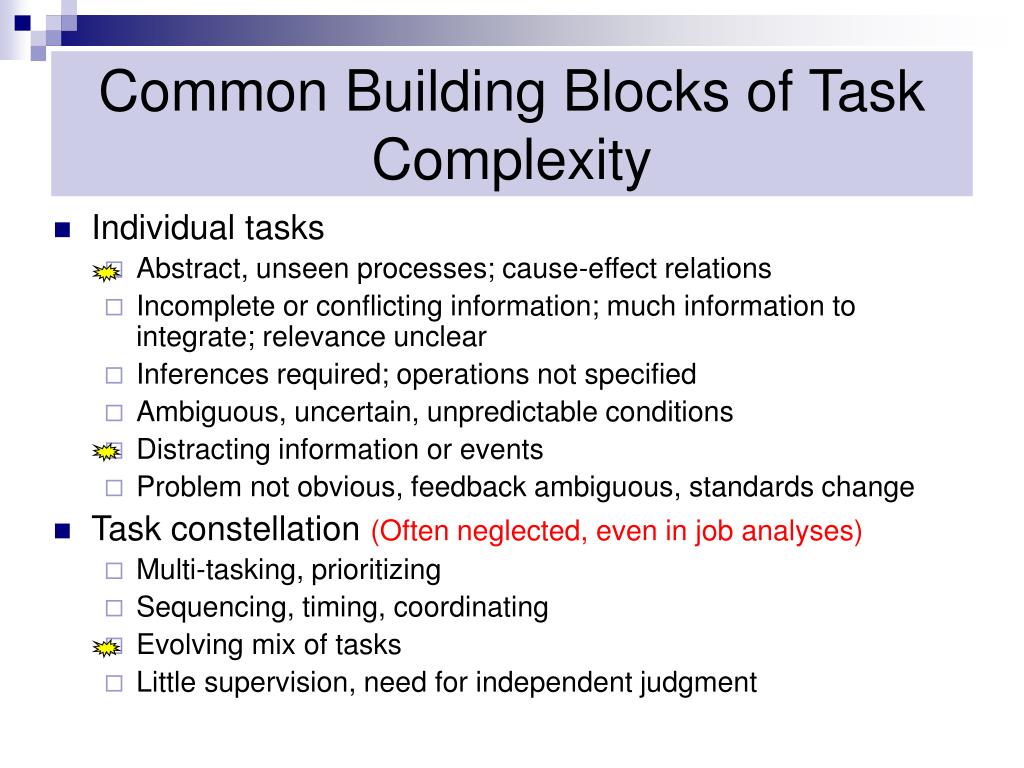 Common Building Blocks of Task Complexity • Individual tasks • Abstract, unseen processes; cause-effect relations • Incomplete or conflicting information; much information to integrate; relevance unclear • Inferences required; operations not specified • Ambiguous, uncertain, unpredictable conditions • Distracting information or events • Problem not obvious, feedback ambiguous, standards change • Task constellation (Often neglected, even in job analyses) • Multi-tasking, prioritizing • Sequencing, timing, coordinating • Evolving mix of tasks • Little supervision, need for independent judgment