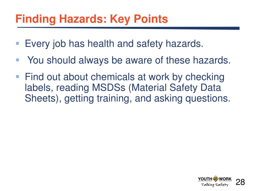 Finding Hazards: Key Points • Every job has health and safety hazards. • You should always be aware of these hazards. • Find out about chemicals at work by checking labels, reading MSDSs (Material Safety Data Sheets), getting training, and asking questions.