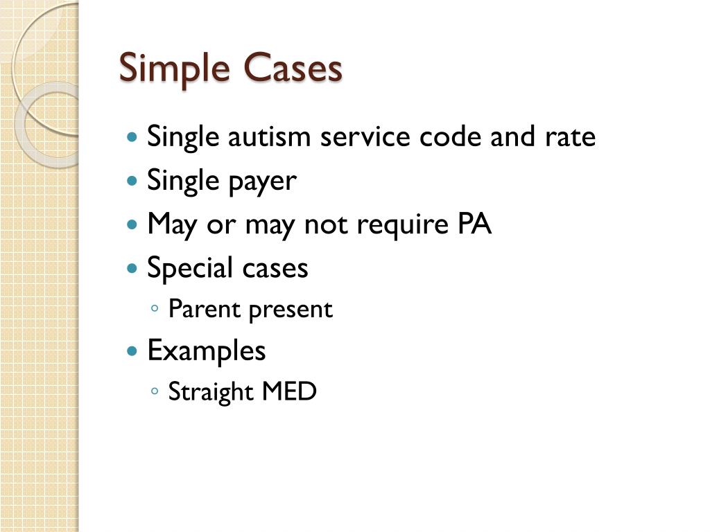 Simple Cases • Single autism service code and rate • Single payer • May or may not require PA • Special cases • Parent present • Examples • Straight MED