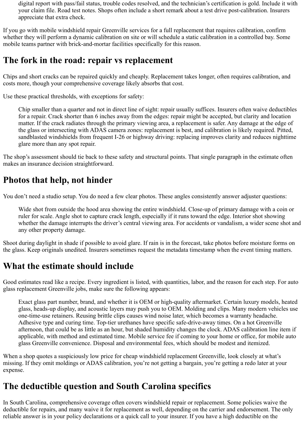 digital report with pass/fail status, trouble codes resolved, and the technician’s certification is gold. Include it with your claim file. Road test notes. Shops often include a short remark about a test drive post-calibration. Insurers appreciate that extra check. If you go with mobile windshield repair Greenville services for a full replacement that requires calibration, confirm whether they will perform a dynamic calibration on site or will schedule a static calibration in a controlled bay. Some mobile teams partner with brick-and-mortar facilities specifically for this reason. The fork in the road: repair vs replacement Chips and short cracks can be repaired quickly and cheaply. Replacement takes longer, often requires calibration, and costs more, though your comprehensive coverage likely absorbs that cost. Use these practical thresholds, with exceptions for safety: Chip smaller than a quarter and not in direct line of sight: repair usually suffices. Insurers often waive deductibles for a repair. Crack shorter than 6 inches away from the edges: repair might be accepted, but clarity and location matter. If the crack radiates through the primary viewing area, a replacement is safer. Any damage at the edge of the glass or intersecting with ADAS camera zones: replacement is best, and calibration is likely required. Pitted, sandblasted windshields from frequent I-26 or highway driving: replacing improves clarity and reduces nighttime glare more than any spot repair. The shop’s assessment should tie back to these safety and structural points. That single paragraph in the estimate often makes an insurance decision straightforward. Photos that help, not hinder You don’t need a studio setup. You do need a few clear photos. These angles consistently answer adjuster questions: Wide shot from outside the hood area showing the entire windshield. Close-up of primary damage with a coin or ruler for scale. Angle shot to capture crack length, especially if it runs toward the edge. Interior shot showing whether the damage interrupts the driver’s central viewing area. For accidents or vandalism, a wider scene shot and any other property damage. Shoot during daylight in shade if possible to avoid glare. If rain is in the forecast, take photos before moisture forms on the glass. Keep originals unedited. Insurers sometimes request the metadata timestamp when the event timing matters. What the estimate should include Good estimates read like a recipe. Every ingredient is listed, with quantities, labor, and the reason for each step. For auto glass replacement Greenville jobs, make sure the following appears: Exact glass part number, brand, and whether it is OEM or high-quality aftermarket. Certain luxury models, heated glass, heads-up display, and acoustic layers may push you to OEM. Molding and clips. Many modern vehicles use one-time-use retainers. Reusing brittle clips causes wind noise later, which becomes a warranty headache. Adhesive type and curing time. Top-tier urethanes have specific safe-drive-away times. On a hot Greenville afternoon, that could be as little as an hour, but shaded humidity changes the clock. ADAS calibration line item if applicable, with method and estimated time. Mobile service fee if coming to your home or office, for mobile auto glass Greenville convenience. Disposal and environmental fees, which should be modest and itemized. When a shop quotes a suspiciously low price for cheap windshield replacement Greenville, look closely at what’s missing. If they omit moldings or ADAS calibration, you’re not getting a bargain, you’re getting a redo later at your expense. The deductible question and South Carolina specifics In South Carolina, comprehensive coverage often covers windshield repair or replacement. Some policies waive the deductible for repairs, and many waive it for replacement as well, depending on the carrier and endorsement. The only reliable answer is in your policy declarations or a quick call to your insurer. If you have a high deductible on the