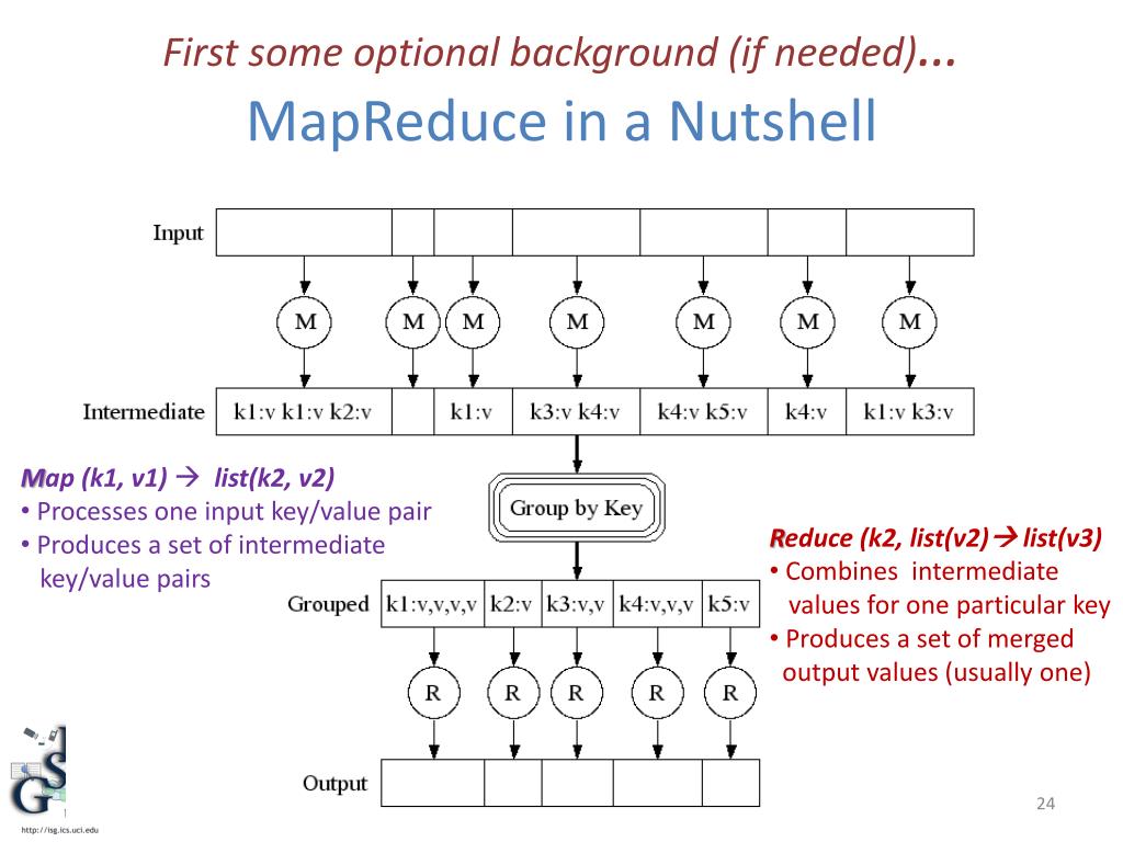 First some optional background (if needed)…MapReduce in a Nutshell • Map (k1, v1) list(k2, v2) • Processes one input key/value pair • Produces a set of intermediate • key/value pairs • Reduce (k2, list(v2) list(v3) • Combines intermediate • values for one particular key • Produces a set of merged • output values (usually one)