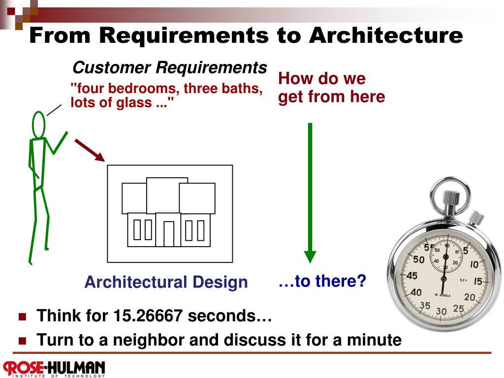 From Requirements to Architecture • Think for 15.26667 seconds… • Turn to a neighbor and discuss it for a minute Customer Requirements "four bedrooms, three baths, lots of glass ..." How do we get fromhere …to there? Architectural Design
