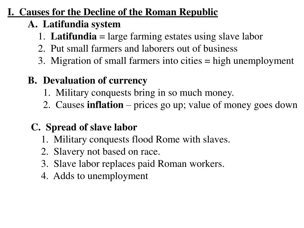 I. Causes for the Decline of the Roman Republic A. Latifundia system 1. Latifundia = large farming estates using slave labor 2. Put small farmers and laborers out of business 3. Migration of small farmers into cities = high unemployment • Devaluation of currency • 1. Military conquests bring in so much money. • 2. Causes inflation – prices go up; value of money goes down C. Spread of slave labor 1. Military conquests flood Rome with slaves. 2. Slavery not based on race. 3. Slave labor replaces paid Roman workers. 4. Adds to unemployment