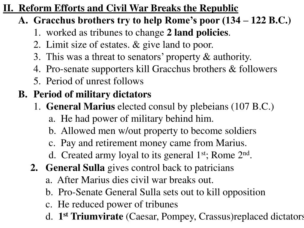 II. Reform Efforts and Civil War Breaks the Republic A. Gracchus brothers try to help Rome’s poor (134 – 122 B.C.) 1. worked as tribunes to change 2 land policies. 2. Limit size of estates. & give land to poor. 3. This was a threat to senators’ property & authority. 4. Pro-senate supporters kill Gracchus brothers & followers 5. Period of unrest follows • Period of military dictators • 1. General Marius elected consul by plebeians (107 B.C.) • a. He had power of military behind him. • b. Allowed men w/out property to become soldiers • c. Pay and retirement money came from Marius. • d. Created army loyal to its general 1st; Rome 2nd. • General Sulla gives control back to patricians • a. After Marius dies civil war breaks out. • b. Pro-Senate General Sulla sets out to kill opposition • c. He reduced power of tribunes • d. 1st Triumvirate (Caesar, Pompey, Crassus)replaced dictators