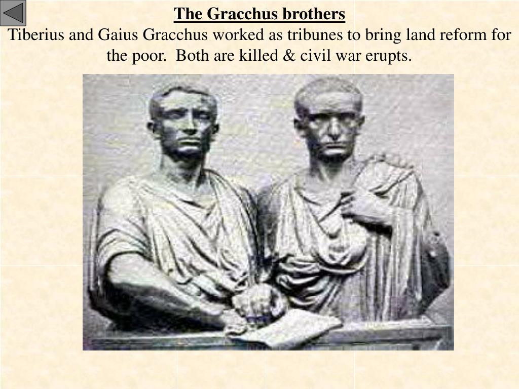 The Gracchus brothers Tiberius and Gaius Gracchus worked as tribunes to bring land reform for the poor. Both are killed & civil war erupts.