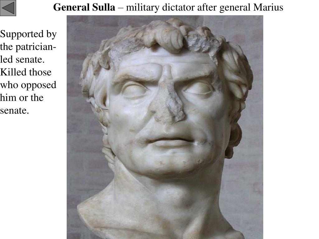 General Sulla – military dictator after general Marius Supported by the patrician-led senate. Killed those who opposed him or the senate.