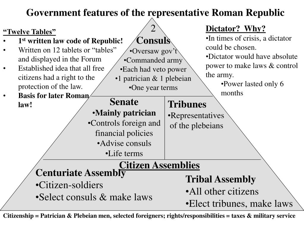 Government features of the representative Roman Republic 2 Consuls Dictator? Why? Twelve Tables Senate Tribunes Citizen Assemblies Centuriate Assembly Tribal Assembly Citizenship = Patrician & Plebeian men, selected foreigners; rights/responsibilities = taxes & military service