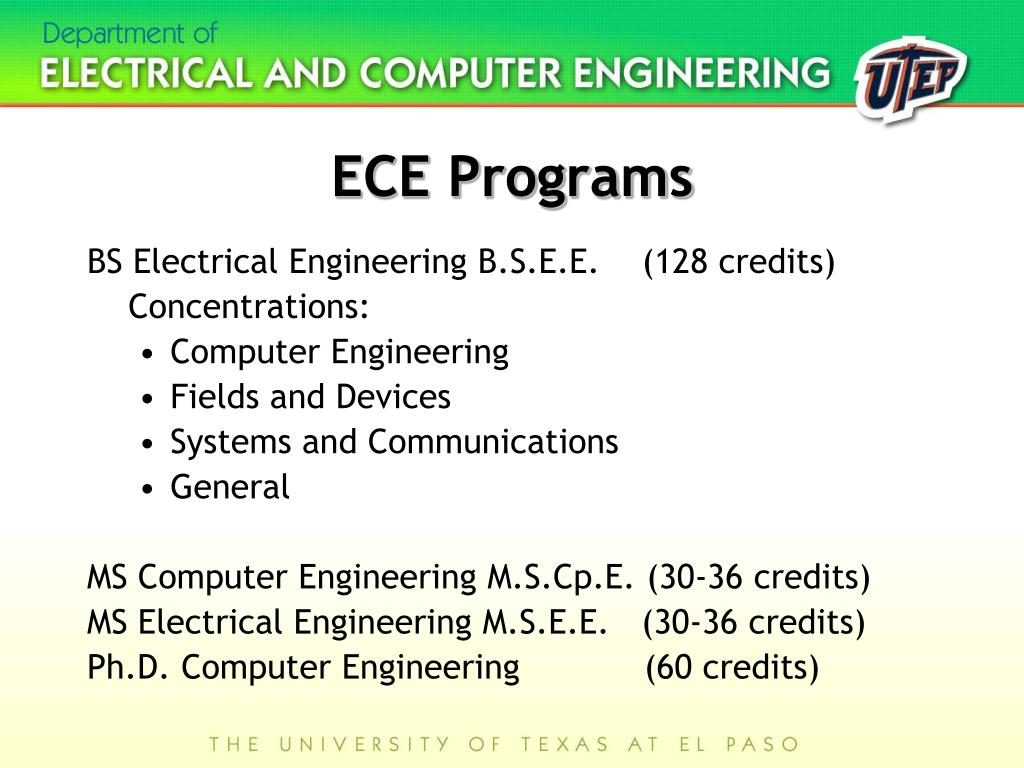Student Organizationswithin ECE Department • Institute of Electrical and Electronics Engineers (IEEE) – International EE Society that – sets technical standards – sponsors technical conferences – sponsors workshops – publishes reference texts – provides for HR-type needs Office for UTEP Student branch within IEEE Student Lounge • Eta Kappa Nu (HKN) – EE Honor Society – Office within IEEE Student Lounge