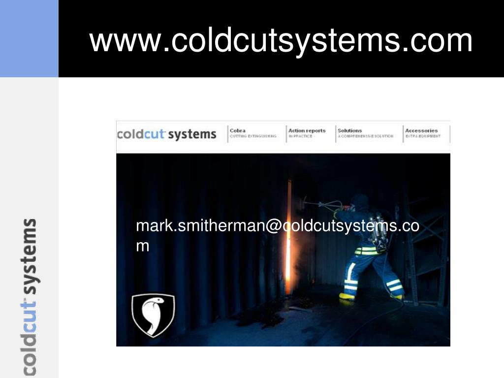 Development in the UK • Initial focus was the product. • Resulting in singular use and specialist application. • New focus is the method. • Strategic development of the Cutting Extinguisher Concept. • Integrated with operational and command understanding. • Facilitating development and innovation. • Working strategically with service users. • Enhancing support quality and response. Our aim is to help services link the coldcut™cobra with the strategic development of their operational plans and organisational strategies.