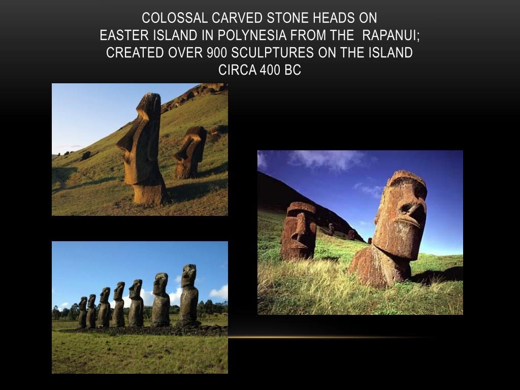 colossal carved stone heads on Easter island in Polynesia from the rapanui; created over 900 sculptures on the islandcirca 400 bc