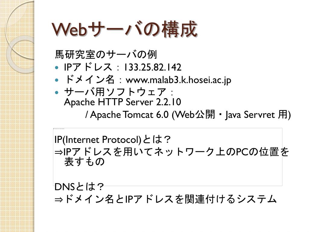 Webサーバの構成 馬研究室のサーバの例 • IPアドレス:133.25.82.142 • ドメイン名:www.malab3.k.hosei.ac.jp • サーバ用ソフトウェア:ApacheHTTP Server 2.2.10 / Apache Tomcat 6.0 (Web公開・Java Servret 用) IP(Internet Protocol)とは? ⇒IPアドレスを用いてネットワーク上のPCの位置を表すもの DNSとは? ⇒ドメイン名とIPアドレスを関連付けるシステム