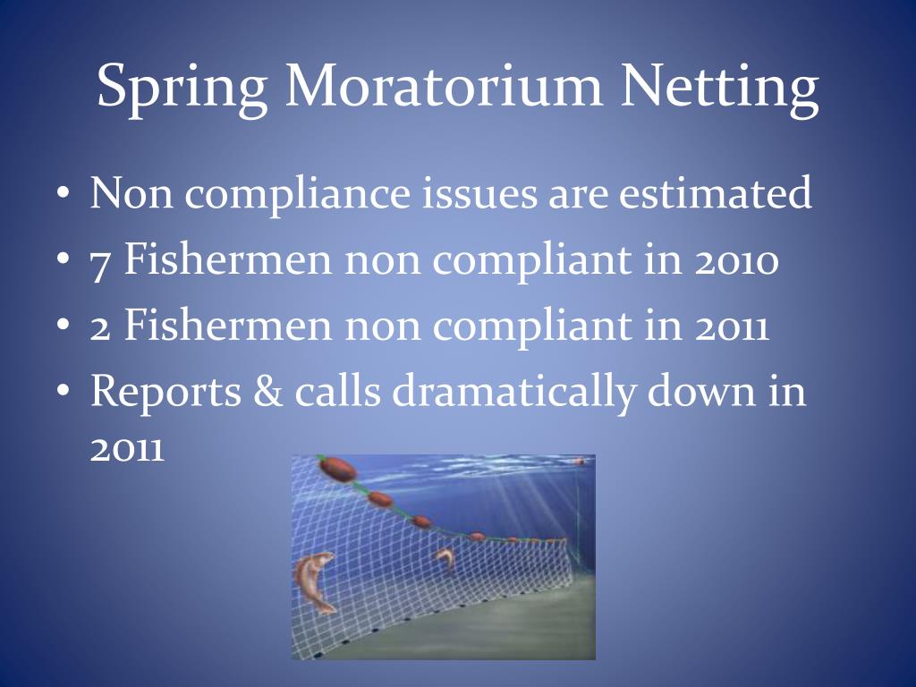 Spring Moratorium Netting • Non compliance issues are estimated • 7 Fishermen non compliant in 2010 • 2 Fishermen non compliant in 2011 • Reports & calls dramatically down in 2011