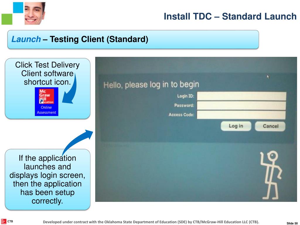 Click Test Delivery Client software shortcut icon. Install the TDC-Standard Launch Install TDC – Standard Launch • If the application launches and displays login screen, then the application has been setup correctly. Developed under contract with the Oklahoma State Department of Education (SDE) by CTB/McGraw-Hill Education LLC (CTB). Slide 50