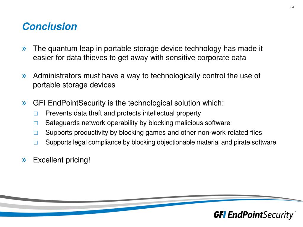 Conclusion • The quantum leap in portable storage device technology has made it easier for data thieves to get away with sensitive corporate data • Administrators must have a way to technologically control the use of portable storage devices • GFI EndPointSecurity is the technological solution which: • Prevents data theft and protects intellectual property • Safeguards network operability by blocking malicious software • Supports productivity by blocking games and other non-work related files • Supports legal compliance by blocking objectionable material and pirate software • Excellent pricing!