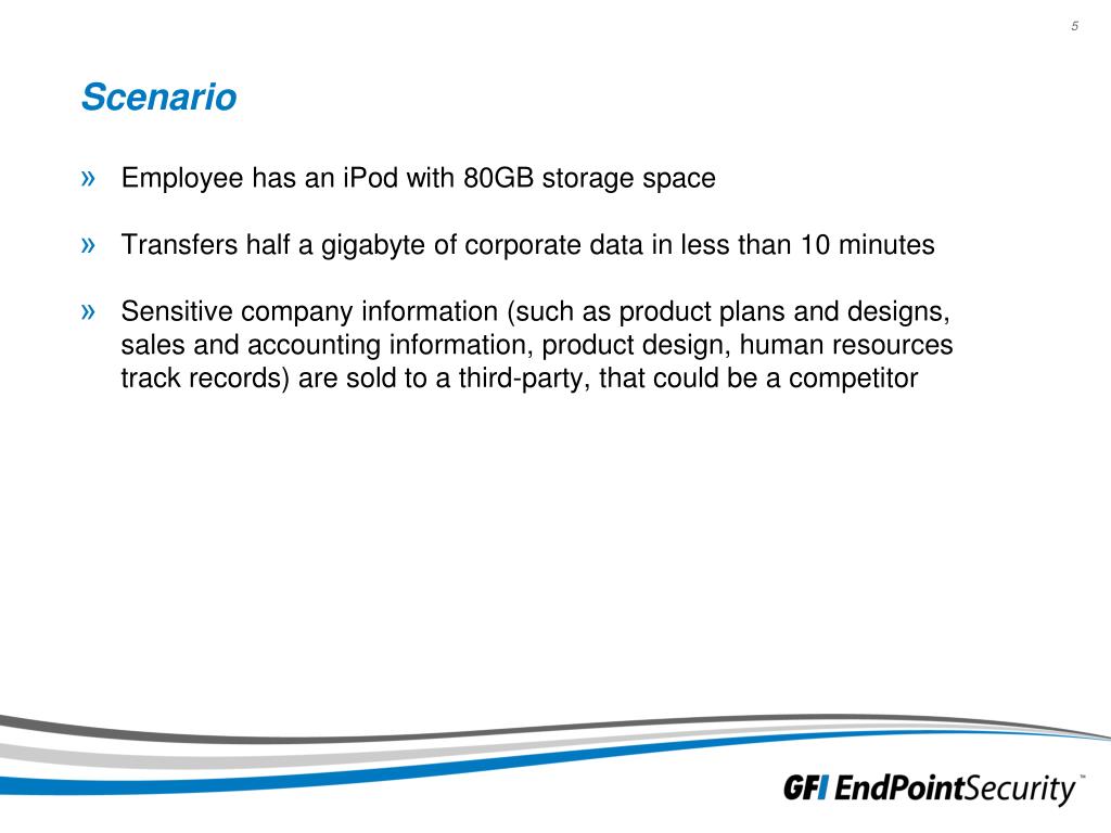 Scenario • Employee has an iPod with 80GB storage space • Transfers half a gigabyte of corporate data in less than 10 minutes • Sensitive company information (such as product plans and designs, sales and accounting information, product design, human resources track records) are sold to a third-party, that could be a competitor