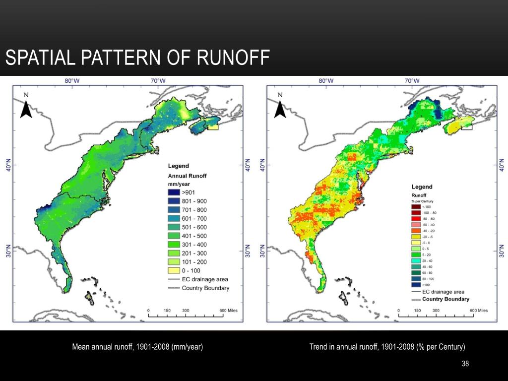 Spatial pattern of runoff Mean annual runoff, 1901-2008 (mm/year) Trend in annual runoff, 1901-2008 (% per Century)