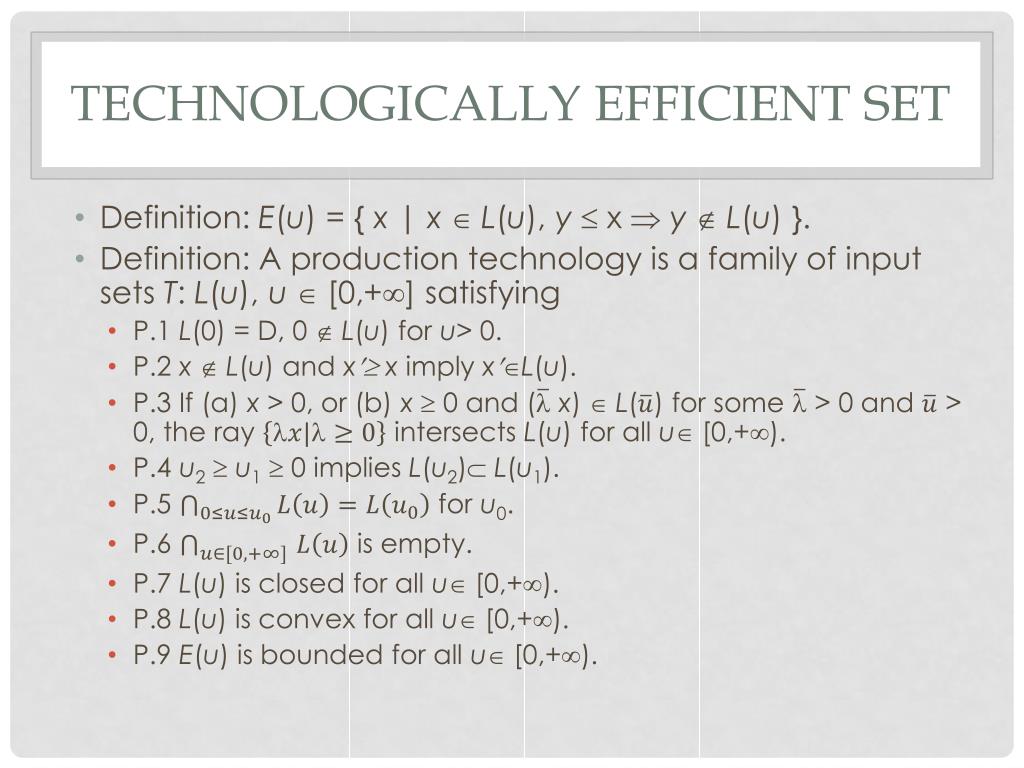 Technologically Efficient Set • Definition: E(u) = { x | x L(u), y x y L(u) }. • Definition: A production technology is a family of input sets T: L(u), u [0,+] satisfying • P.1 L(0) = D, 0 L(u) for u> 0. • P.2 x L(u) and x x imply xL(u). • P.3 If (a) x > 0, or (b) x 0 and (x) L() for some > 0 and > 0, the ray intersects L(u) for all u [0,+). • P.4 u2 u1 0 implies L(u2) L(u1). • P.5 for u0. • P.6 is empty. • P.7 L(u) is closed for all u [0,+). • P.8 L(u) is convex for all u [0,+). • P.9 E(u) is bounded for all u [0,+).