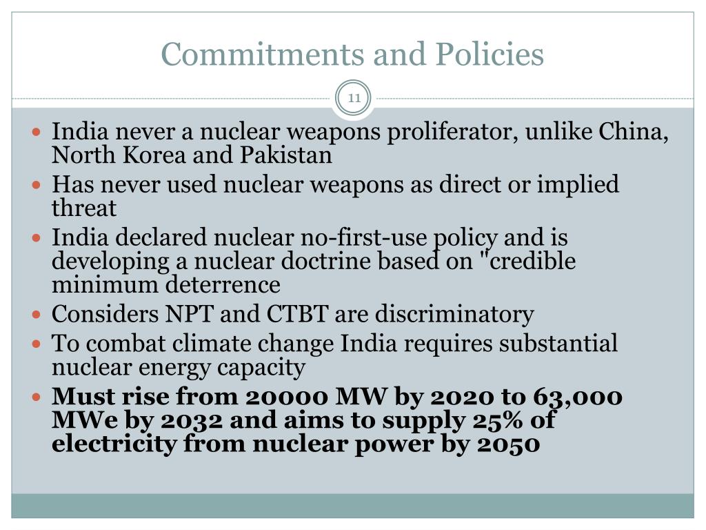 Commitments and Policies • India never a nuclear weapons proliferator, unlike China, North Korea and Pakistan • Has never used nuclear weapons as direct or implied threat • India declared nuclear no-first-use policy and is developing a nuclear doctrine based on "credible minimum deterrence • Considers NPT and CTBT are discriminatory • To combat climate change India requires substantial nuclear energy capacity • Must rise from 20000 MW by 2020 to 63,000 MWe by 2032 and aims to supply 25% of electricity from nuclear power by 2050