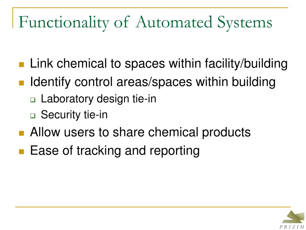 Functionality of Automated Systems • Link chemical to spaces within facility/building • Identify control areas/spaces within building • Laboratory design tie-in • Security tie-in • Allow users to share chemical products • Ease of tracking and reporting