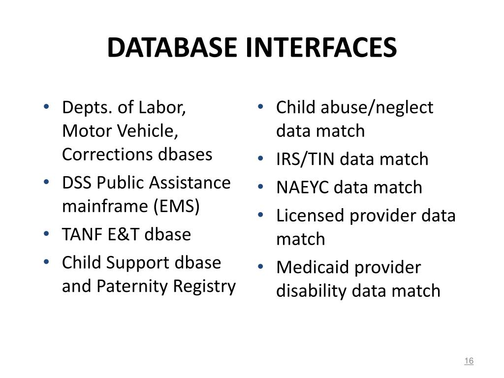 Database Interfaces • Depts. of Labor, Motor Vehicle, Corrections dbases • DSS Public Assistance mainframe (EMS) • TANF E&T dbase • Child Support dbase and Paternity Registry • Child abuse/neglect data match • IRS/TIN data match • NAEYC data match • Licensed provider data match • Medicaid provider disability data match