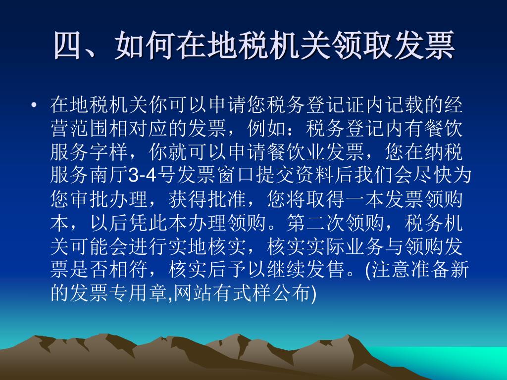 四、如何在地税机关领取发票 • 在地税机关你可以申请您税务登记证内记载的经营范围相对应的发票,例如:税务登记内有餐饮服务字样,你就可以申请餐饮业发票,您在纳税服务南厅3-4号发票窗口提交资料后我们会尽快为您审批办理,获得批准,您将取得一本发票领购本,以后凭此本办理领购。第二次领购,税务机关可能会进行实地核实,核实实际业务与领购发票是否相符,核实后予以继续发售。(注意准备新的发票专用章,网站有式样公布)