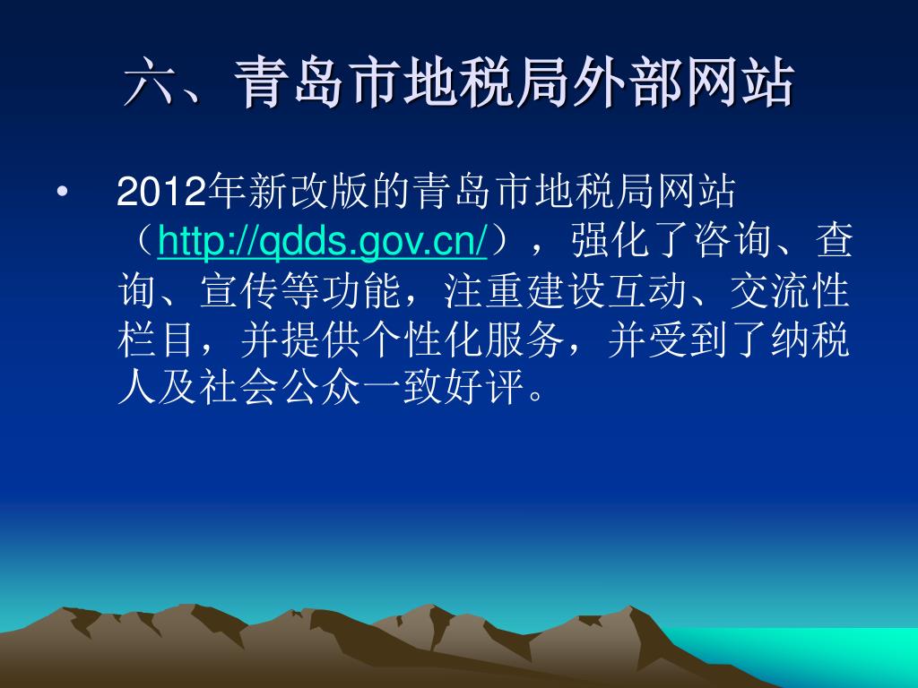 六、青岛市地税局外部网站 • 2012年新改版的青岛市地税局网站(http://qdds.gov.cn/),强化了咨询、查询、宣传等功能,注重建设互动、交流性栏目,并提供个性化服务,并受到了纳税人及社会公众一致好评。