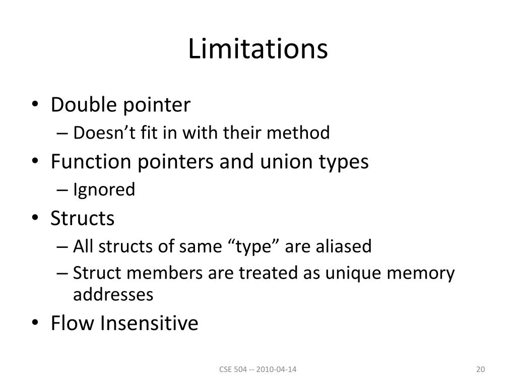 Limitations • Double pointer • Doesn’t fit in with their method • Function pointers and union types • Ignored • Structs • All structs of same “type” are aliased • Struct members are treated as unique memory addresses • Flow Insensitive CSE 504 -- 2010-04-14
