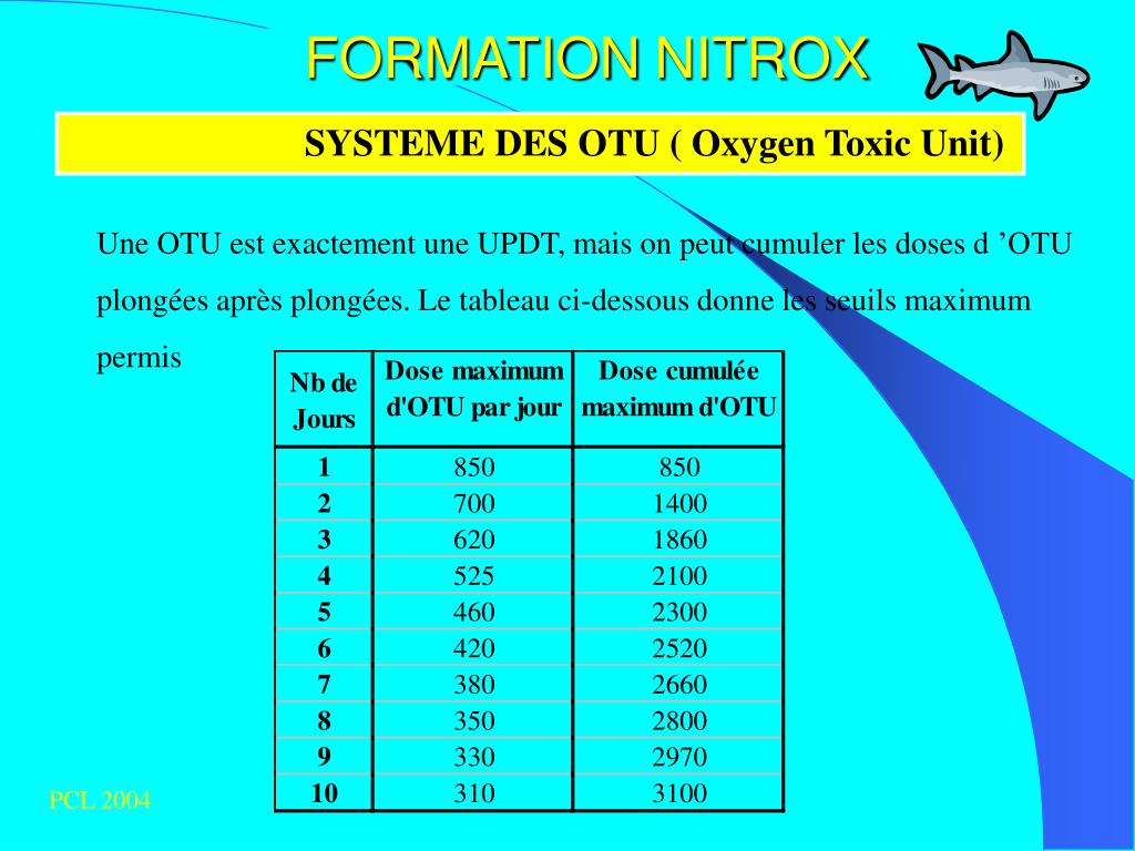 FORMATIONNITROX SYSTEME DES OTU ( Oxygen Toxic Unit) Une OTU est exactement une UPDT, mais on peut cumuler les doses d ’OTU plongées après plongées. Le tableau ci-dessous donne les seuils maximum permis