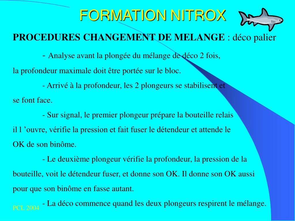 FORMATIONNITROX PROCEDURES CHANGEMENT DE MELANGE : déco palier - Analyse avant la plongée du mélange de déco 2 fois, la profondeur maximale doit être portée sur le bloc. - Arrivé à la profondeur, les 2 plongeurs se stabilisent et se font face. - Sur signal, le premier plongeur prépare la bouteille relais il l ’ouvre, vérifie la pression et fait fuser le détendeur et attende le OK de son binôme. - Le deuxième plongeur vérifie la profondeur, la pression de la bouteille, voit le détendeur fuser, et donne son OK. Il donne son OK aussi pour que son binôme en fasse autant. - La déco commence quand les deux plongeurs respirent le mélange.