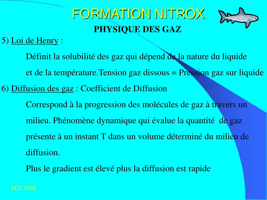 FORMATIONNITROX PHYSIQUE DES GAZ 5) Loi de Henry : Définit la solubilité des gaz qui dépend de la nature du liquide et de la température.Tension gaz dissous = Pression gaz sur liquide 6) Diffusion des gaz : Coefficient de Diffusion Correspond à la progression des molécules de gaz à travers un milieu. Phénomène dynamique qui évalue la quantité de gaz présente à un instant T dans un volume déterminé du milieu de diffusion. Plus le gradient est élevé plus la diffusion est rapide
