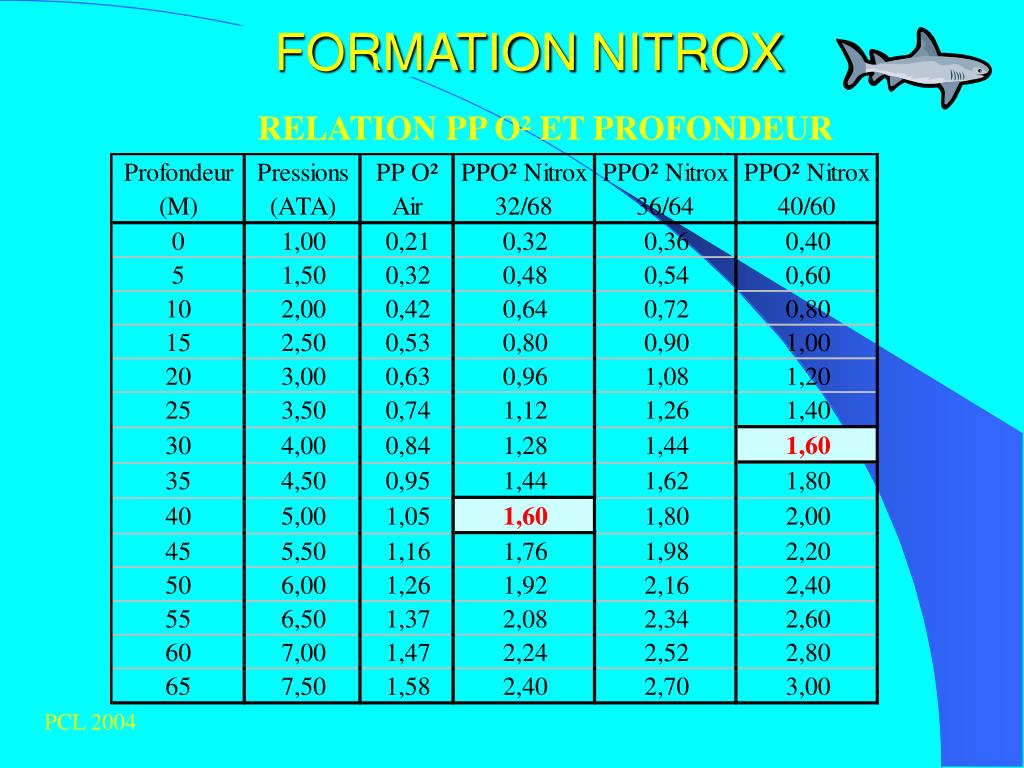 FORMATIONNITROX LIMITES SUR LES PP D ’O² 1.60 Bars : Valeur maximale pour la plongée technique et en décompression. 1.40 Bars : Valeur recommandée en cas de froid et travail intense 1.50 Bars : Valeur maximale en mélange fond pour plongée technique