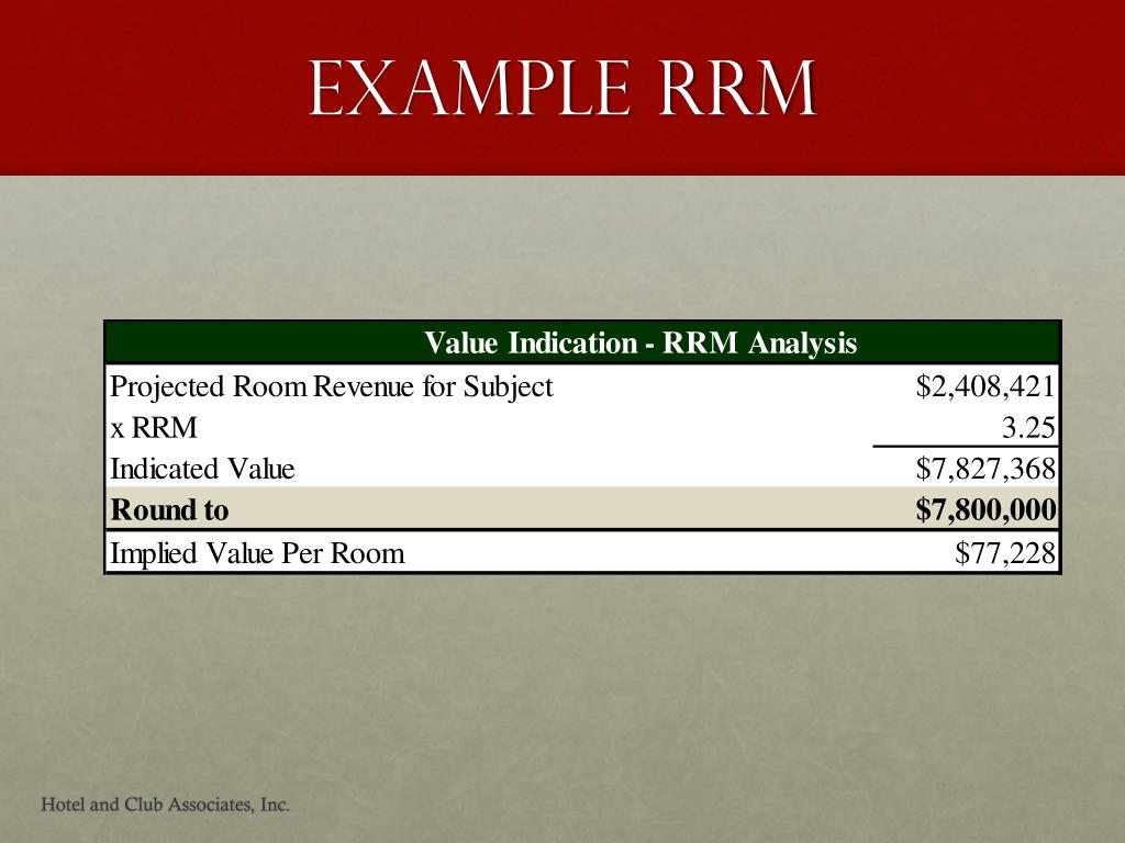 Room Revenue Multiplier • Room Revenue Multiplier – RRM • RRM = Sale Price/Value ÷ Room Revenue* • *exclude occupancy taxes and sales taxes • Value = Room Revenue x RRM • RRM - Income or Sales Comparison Approach? • Frequently Used in Market – Especially for Mid Tier and Under Properties, Mom-and-pops, B&Bs • Develop RRMs from Sales and Conversations with Market Participants • Simple but Effective Valuation Tool Hotel and Club Associates, Inc.