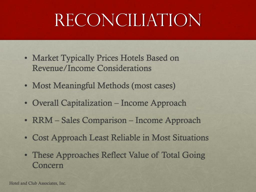 Reconciliation • Market Typically Prices Hotels Based on Revenue/Income Considerations • Most Meaningful Methods (most cases) • Overall Capitalization – Income Approach • RRM – Sales Comparison – Income Approach • Cost Approach Least Reliable in Most Situations • These Approaches Reflect Value of Total Going Concern Hotel and Club Associates, Inc.