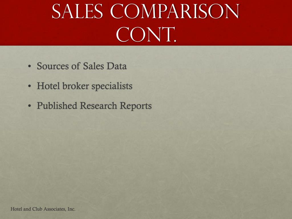 Sales Comparison Cont. • Sources of Sales Data • Hotel broker specialists • Published Research Reports Hotel and Club Associates, Inc.