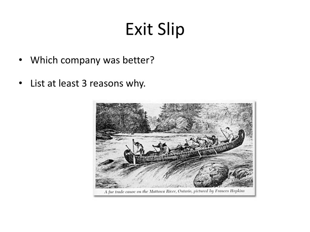 Northwest Company • Less rigid and bossy than the HBC • Hivernants (wintering partners) • Did the actual fur trading & hunting • Voyageurs • Muscle power to paddle canoes and carry cargo • Mapped new areas and established new trading posts • More relaxed in trading standards – willing to bargain and even sold alcohol (HBC refused)