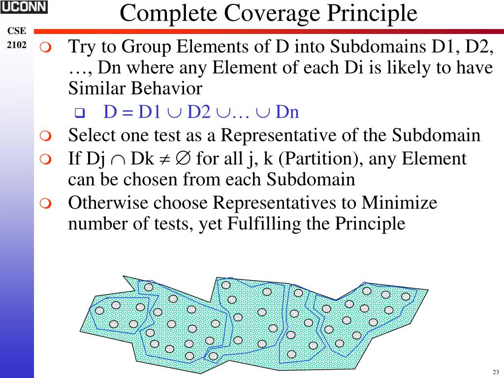 Complete Coverage Principle • Try to Group Elements of D into Subdomains D1, D2, …, Dn where any Element of each Di is likely to have Similar Behavior • D = D1 D2 … Dn • Select one test as a Representative of the Subdomain • If Dj Dk for all j, k (Partition), any Element can be chosen from each Subdomain • Otherwise choose Representatives to Minimize number of tests, yet Fulfilling the Principle