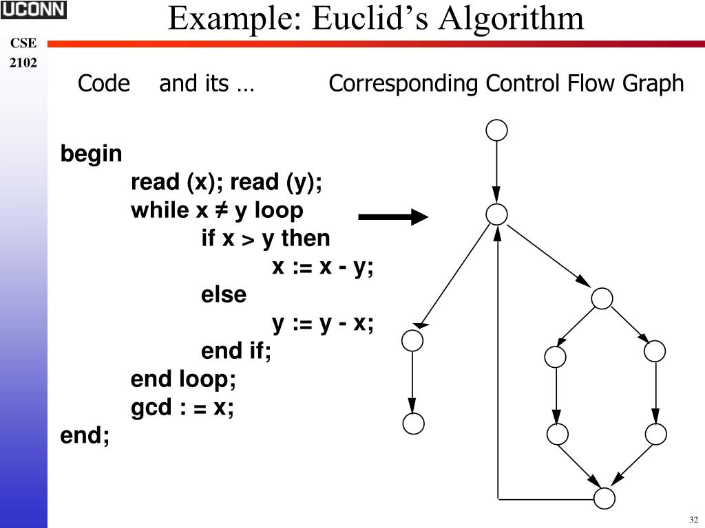 Example: Euclid’s Algorithm Code and its … Corresponding Control Flow Graph begin read (x); read (y); while x ≠ y loop if x > y then x := x - y; else y := y - x; end if; end loop; gcd : = x; end;